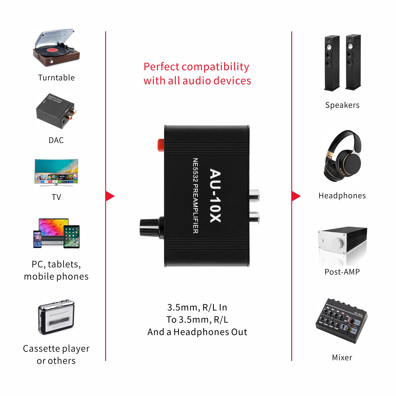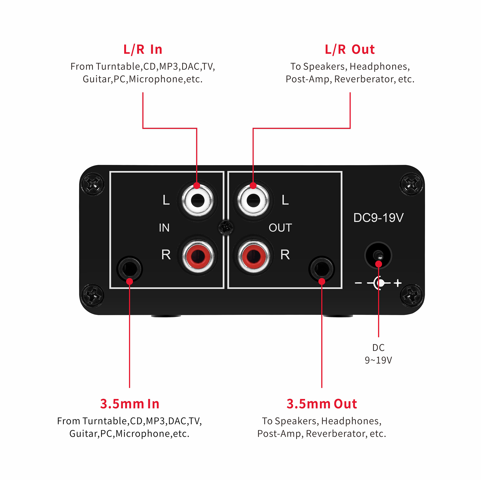 ● Input: RCA (L / R) + 3.5mm, Output: RCA (L / R) + 3.5mm + headphones, Poowered by DC 9-19v, static current about 8Ma. With volume adjustment knob, the volume can be adjusted freely.